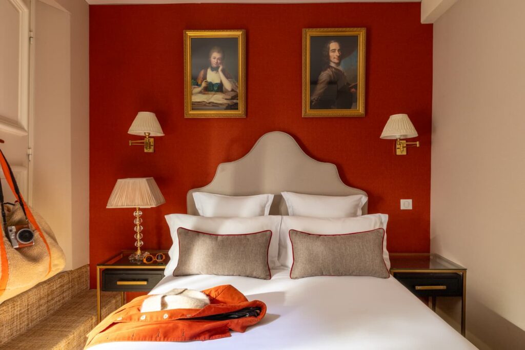 lit double, tissu rouge et cadres avec lampes | hotel saint-germain-des-Prés Paris | bon plan hotel paris