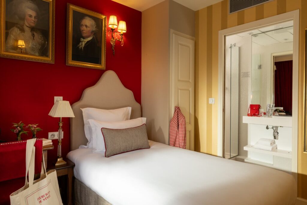 chambre single hotel paris avec un lit individuel, tissu rouge et un cadre, porte ouverte sur la salle d'eau | hotel paris saint-germain-des-pres paris