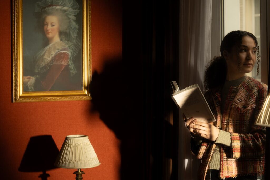 portrait de marie-antoinette sur tissu rouge, femme à la fenetre tenant un livre | hotel saint-germain-des-pres-paris