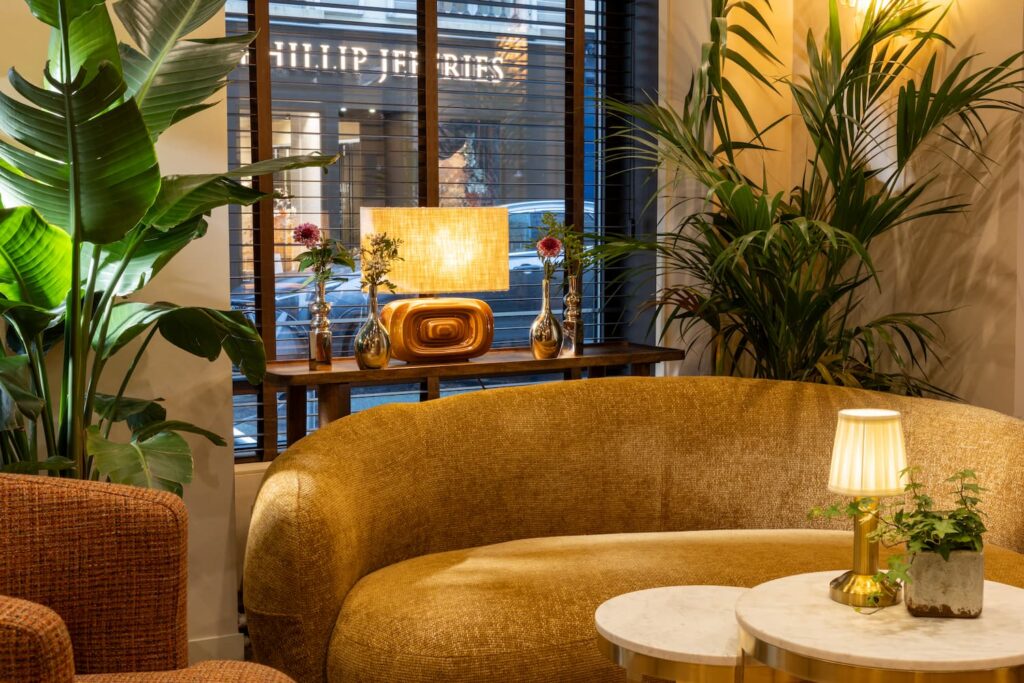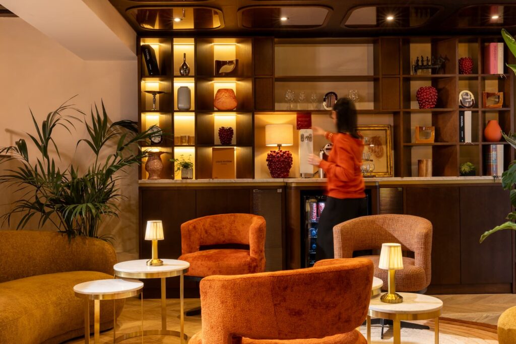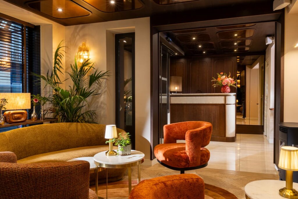 lobby de l'hotel 3 étoiles paris avec bibliotheque, fauteuil, cliente et lumières