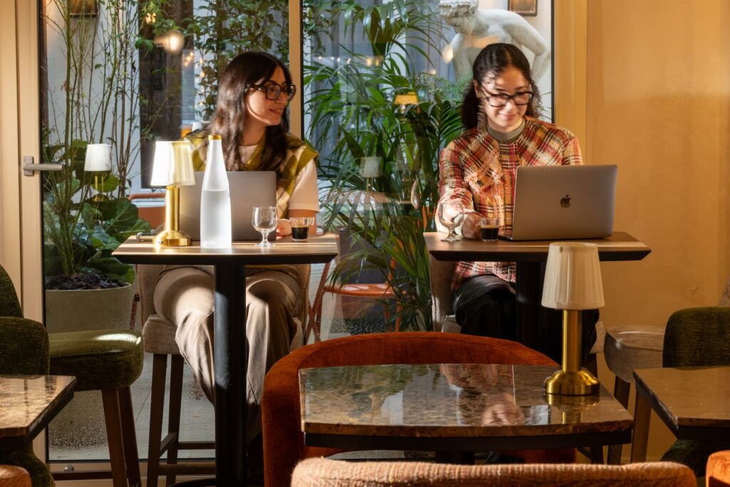 deux jeunes femmes travailles sur leurs ordinateurs, chaises et tables hautes avec une terrasse et des plantes en arrière plan | hotel saint-germain-des-pres | hotel des 2 continents