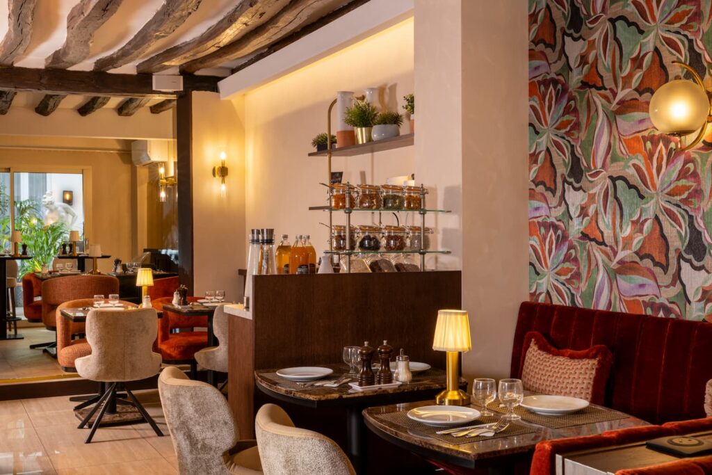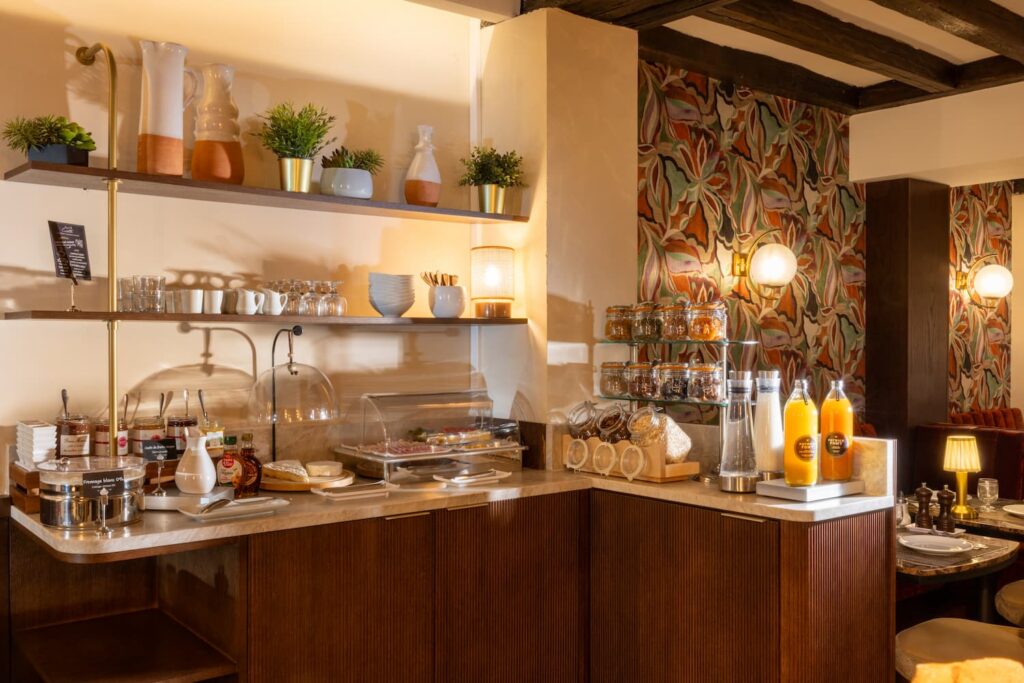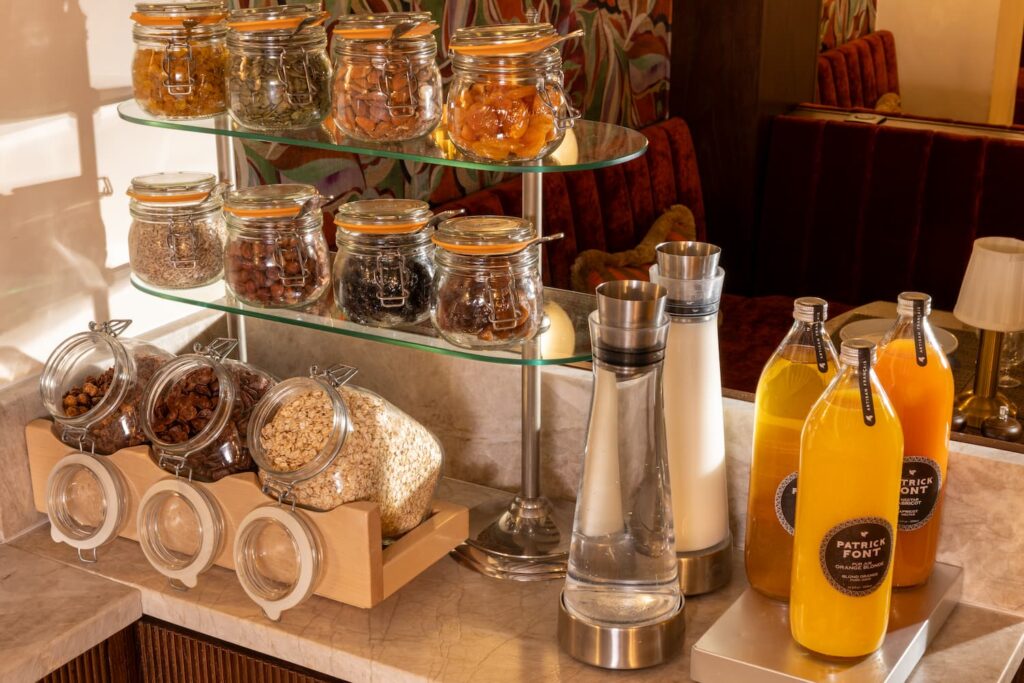 buffet hotel saint-germain-des-pres paris avec céréales, fruits secs et jus frais | hotel des 2 continents