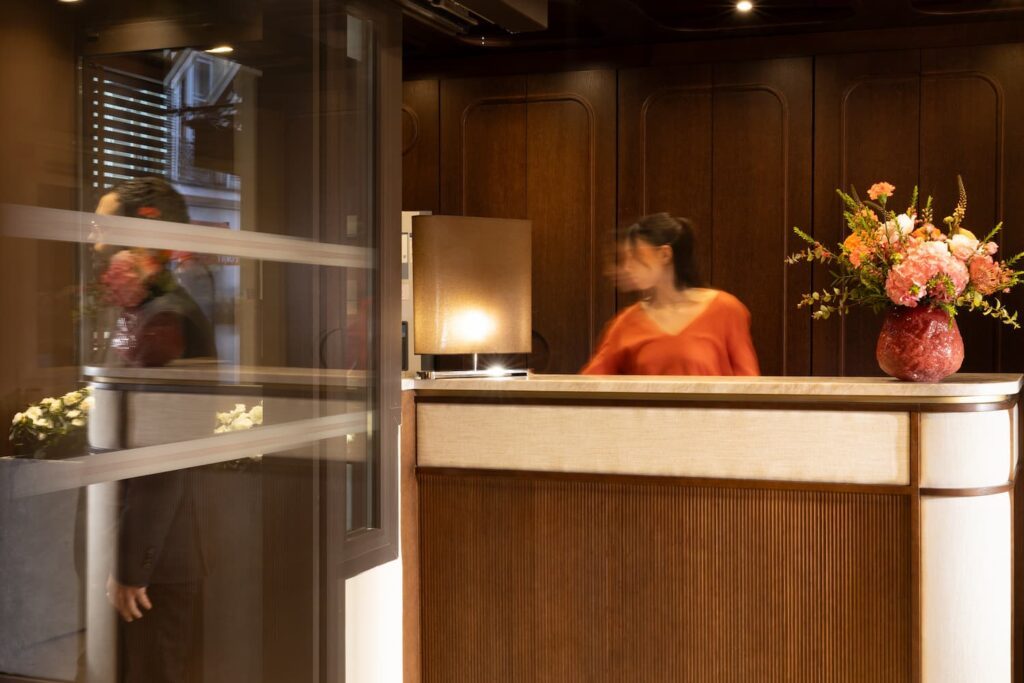 Réception de l'hotel avec receptionniste et fleurs sur le comptoir | hotel 3 étoiles paris 6
