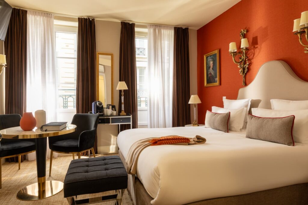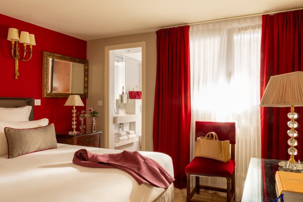 chambre d'hotel calme paris 6 avec rideau rouge, grande fenêtre et tissu rouge | hotel saint-Germain-des-pres paris